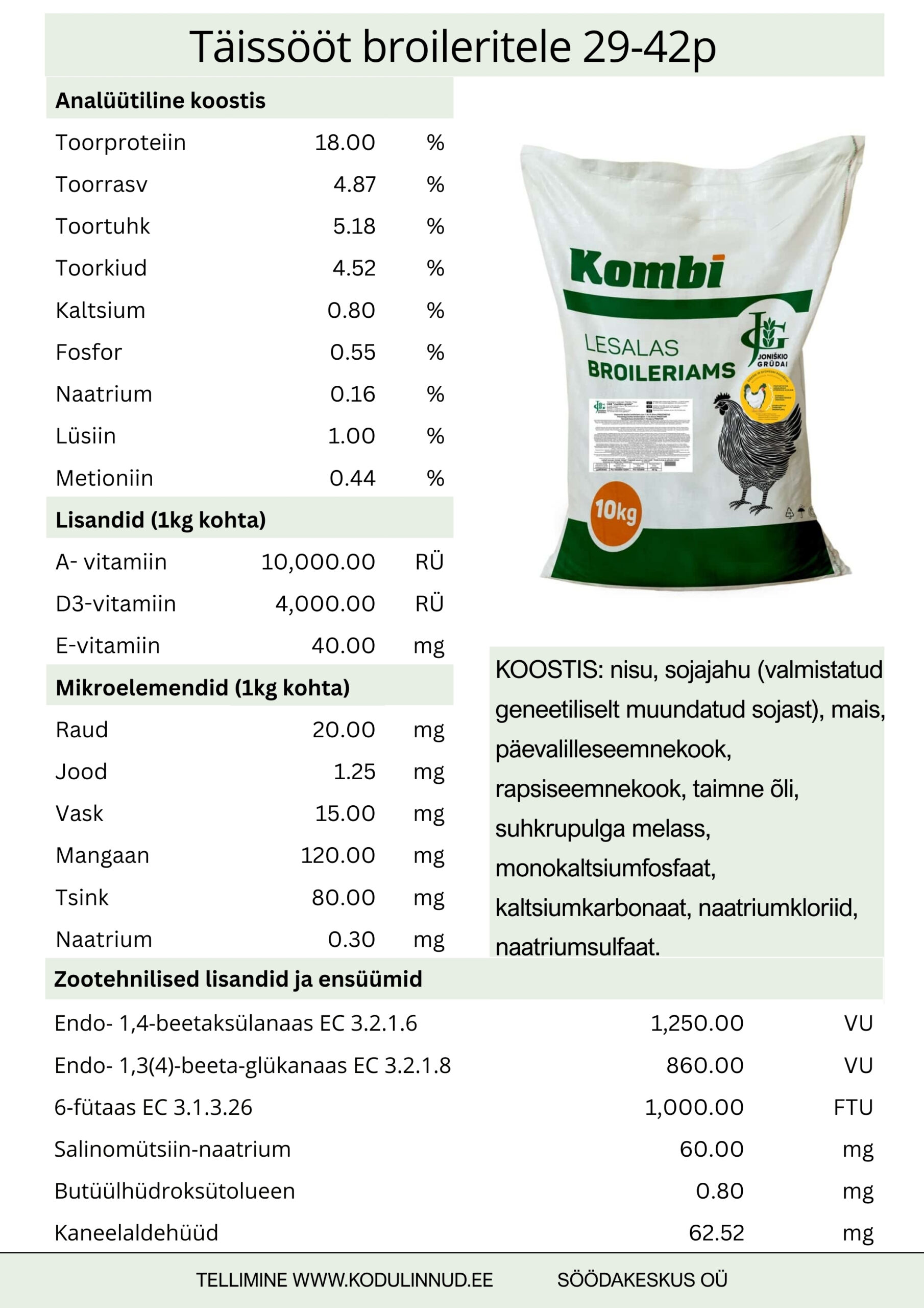 Täisväärtuslik broilerisööt KOMBI on mõeldud 29–42 päeva vanustele broileritele ning toetab lindude lõppkasvuperioodi maksimaalset kasvupotentsiaali ja head tervist. Sööt on rikastatud eeterlike õlidega ehk fütobiootikumidega, mis toimivad soolestiku mikrofloora modulaatoritena ja omavad antibakteriaalset toimet. Nende ainulaadne toime aitab pärssida Clostridium perekonna bakterite arengut ning hoida seedesüsteemi tasakaalus ka stressi ja söödavahetuse korral.