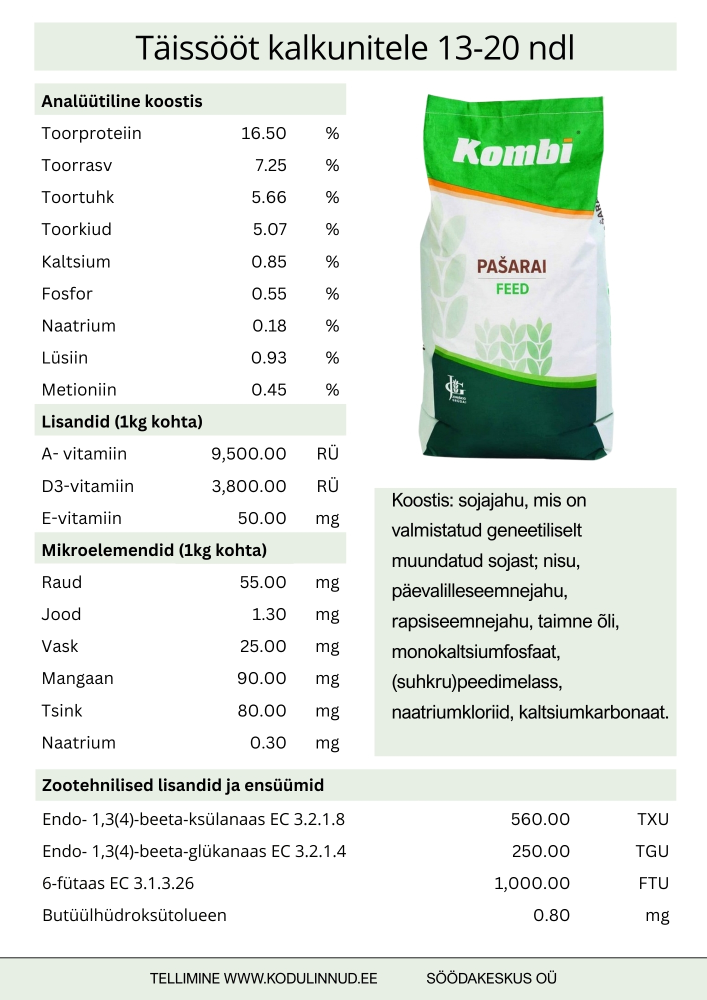 Sööda struktuur (graanulid) on spetsiaalselt kohandatud lõppkasvuperioodiks. Täisväärtuslik kalkunite sööt KOMBI on rikastatud kõigi selles kasvufaasis vajalike vitamiinide ja mineraalainetega.