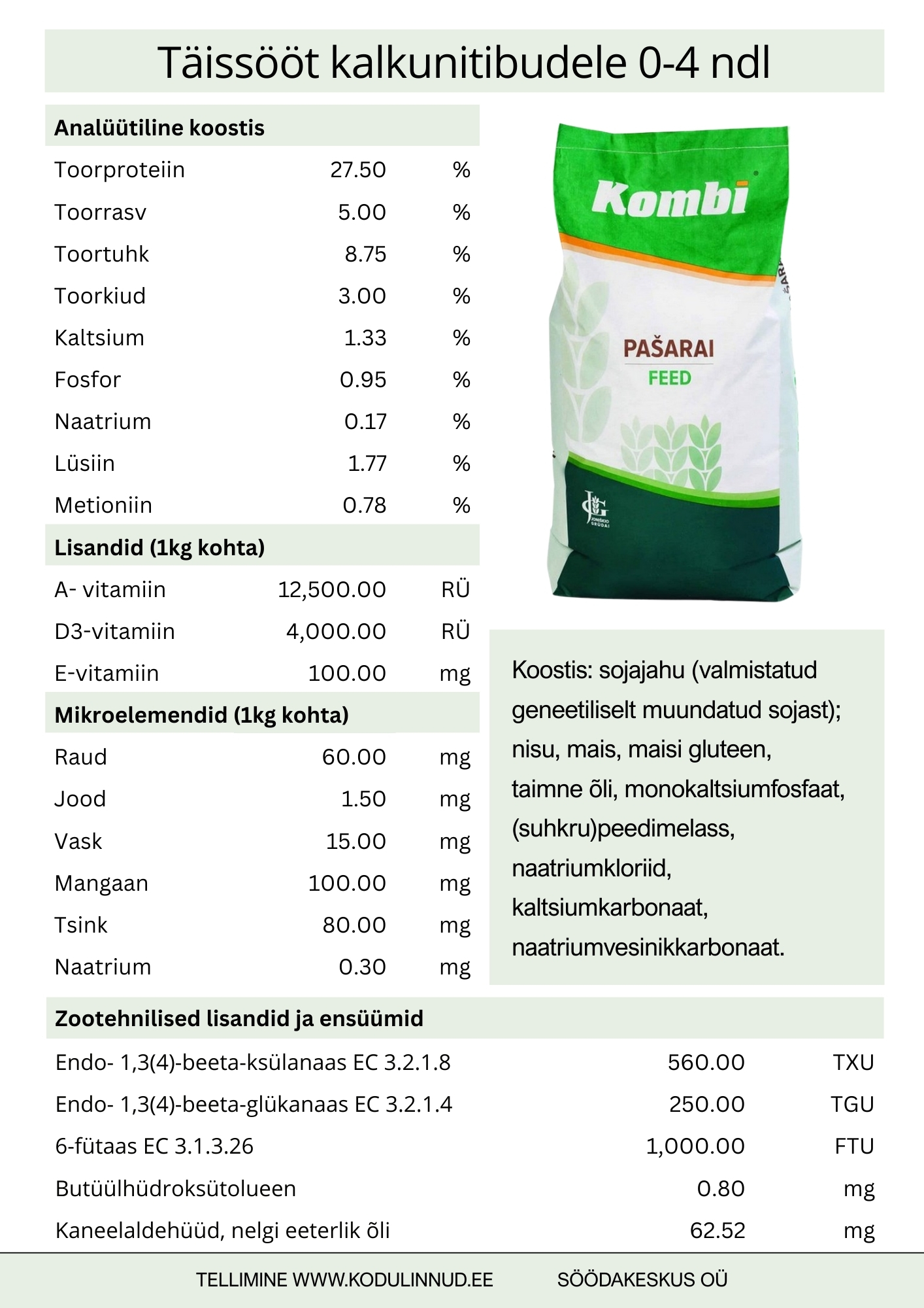 Täisväärtuslik kalkunitibude startersööt KOMBI on mõeldud kalkunitibudele vanuses 0–4 nädalat, mil toimub lindude kõige intensiivsem areng ja kasv. Sellel perioodil on äärmiselt oluline tagada kvaliteetne ja tasakaalustatud toitumine, mis loob tugeva aluse edasiseks kasvuks ja hea tervise säilitamiseks.