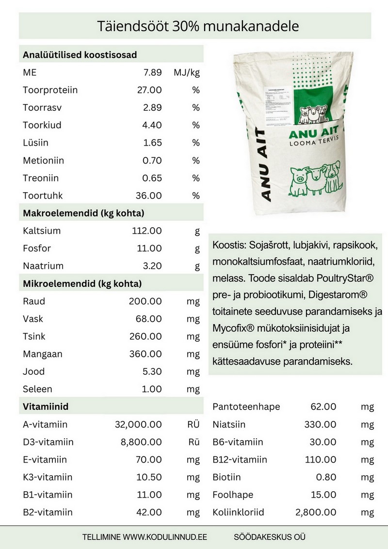 Digestarom – antibakteriaalne ja rakuepiteeli põletikuvastane toime! Stimuleerib seedeensüümide tootmist organismi poolt Biotronic TOP3 – spetsiifiline antibakteriaalne Gram-negatiivsete bakterite arengut pärssiv ja mikrofloora arengut stimuleeriv segu orgaanilistes hapetest, eeterlikest õlidest ja fütogeensetest komponentidest. Vähendamaks patogeenilisi baktereid (kaasaarvatud salmonella) ja parandamaks tootmisefektiivsust. Mineraalid-vitamiinid tagavad tugeva immuunsüsteemi – loomade haigestumise risk väheneb Mükotoksiinide inaktivaator on terviklik lahendus mükotoksiinidega seotud probleemidele, vähendab mükotoksiinide poolt põhjustatud maksa ja seedekulgla limaskesta kahjustusi. Aminohapped – vähendamaks toorproteiini taset söödas ja parandamaks kanade tulemuslikkust ja munade arvu. Kasutamine: Lubatud kasutada ainult segasööda valmistamiseks. Lisatakse munakana segajõusööda valmistamisel 30%.