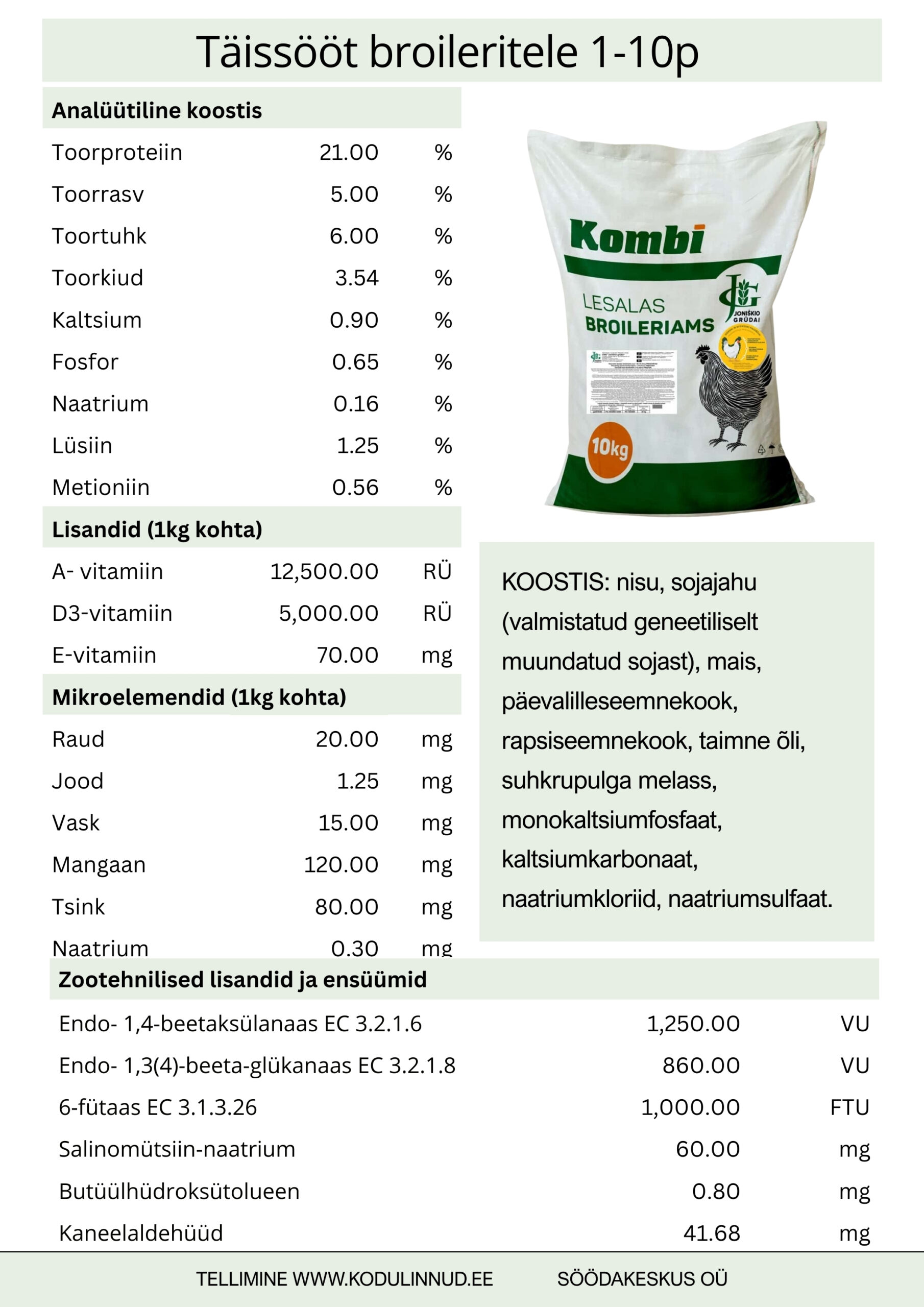 Koostis: nisu, sojajahu (sojarupskid), valmistatud geneetiliselt muundatud sojast, mais, päevalilleseemnejahu, rapsiseemnejääk, taimeõli, (suhkru)peedimelass, monokaltsiumfosfaat, kaltsiumkarbonaat, naatriumkloriid, naatriumsulfaat.