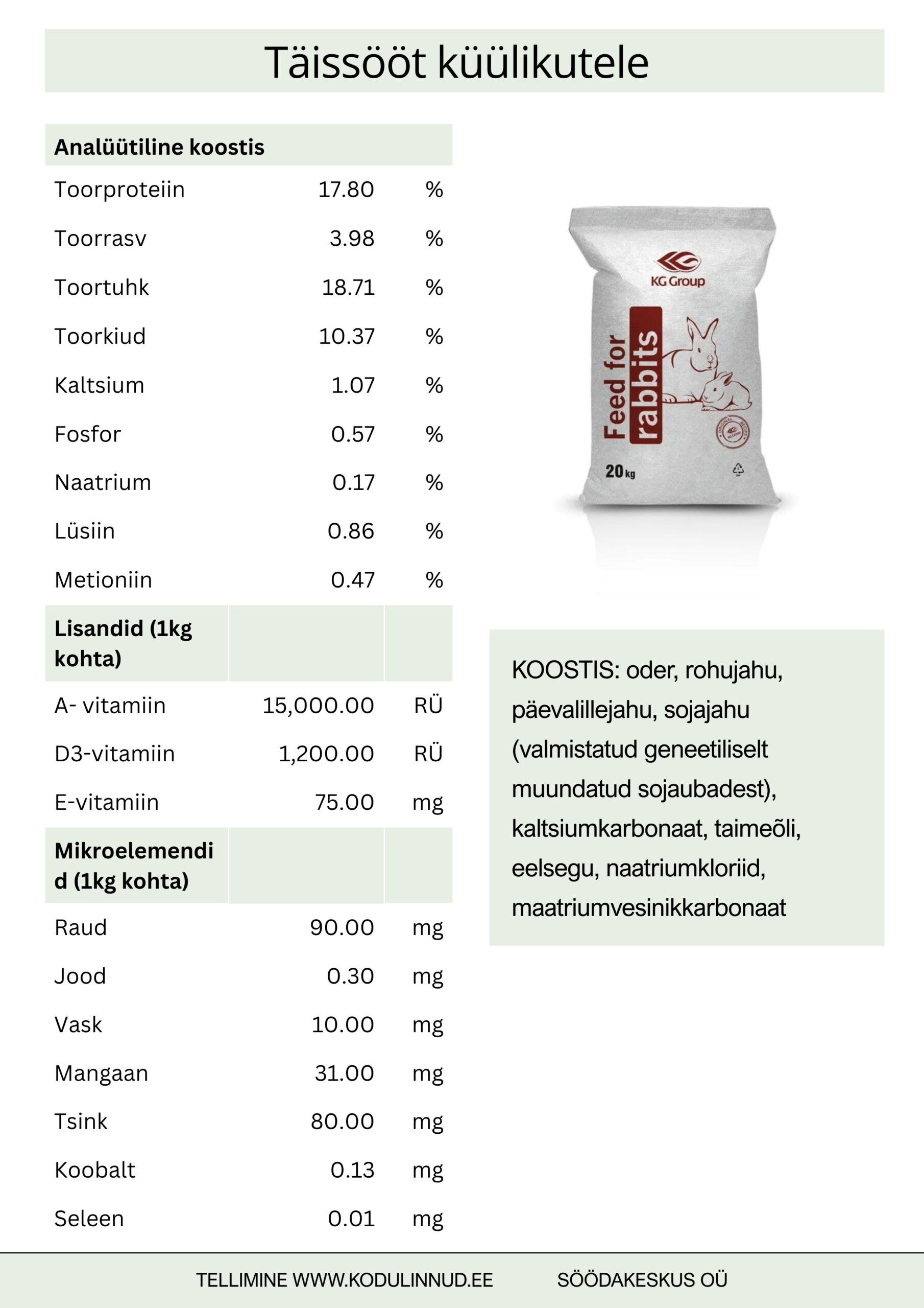 Küülikute tervis ja hea areng algavad tasakaalustatud toitumisest. Küülikutele mõeldud täissööt on kvaliteetne kombineeritud sööt, mis on välja töötatud küülikute toitumisvajadusi arvesse võttes ning sobib igapäevaseks söötmiseks koos heina ja puhta joogiveega. Sööt sisaldab hoolikalt valitud tooraineid, vitamiine ja mineraale, mis toetavad küülikute ühtlast kasvu, seedesüsteemi normaalset toimimist ja üldist elujõulisust. Hea sööda konsistents tagab ühtlase tarbimise ning soodne hinna ja kvaliteedi suhe teeb sellest praktilise valiku nii hobi- kui ka aretusküülikute pidamisel. Sööta tohib ainult etiketil märgitud loomarühmale ning toodet tuleb säilitada kuivas, jahedas ja hästi ventileeritavas ruumis, et tagada sööda kvaliteedi säilimine.