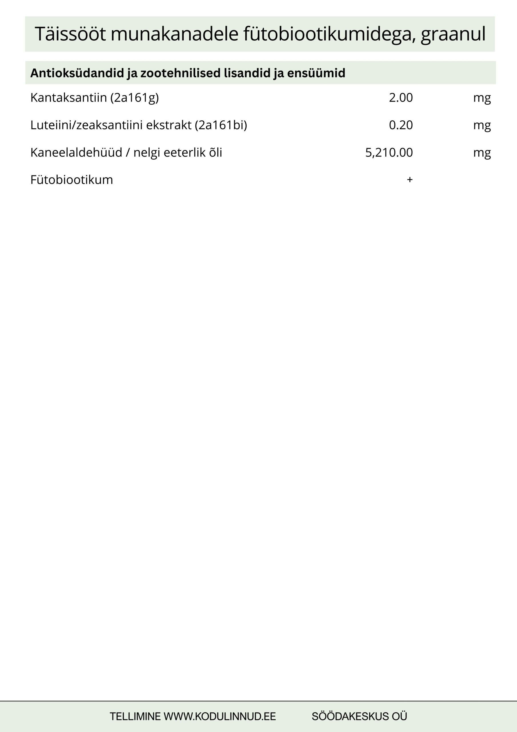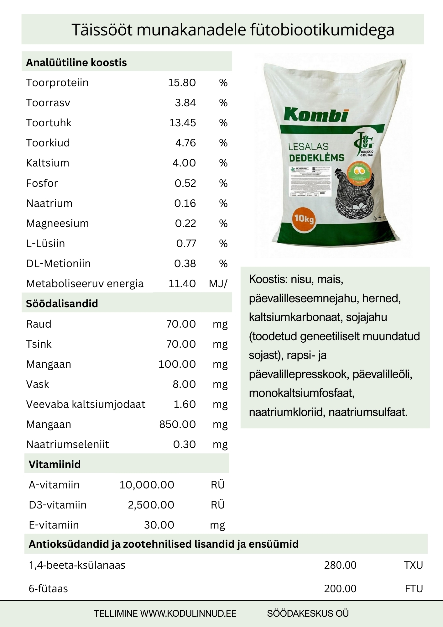 Granuleeritud täissööt munakanadele KOMBI on tasakaalustatud sööt, mis on loodud toetama munade kvaliteeti ja lindude sigimisvõimekust kogu munemisperioodi vältel. Sööt katab täielikult munakanade toitainevajaduse ning aitab saavutada optimaalse munatoodangu ja sobiva munakaalu.