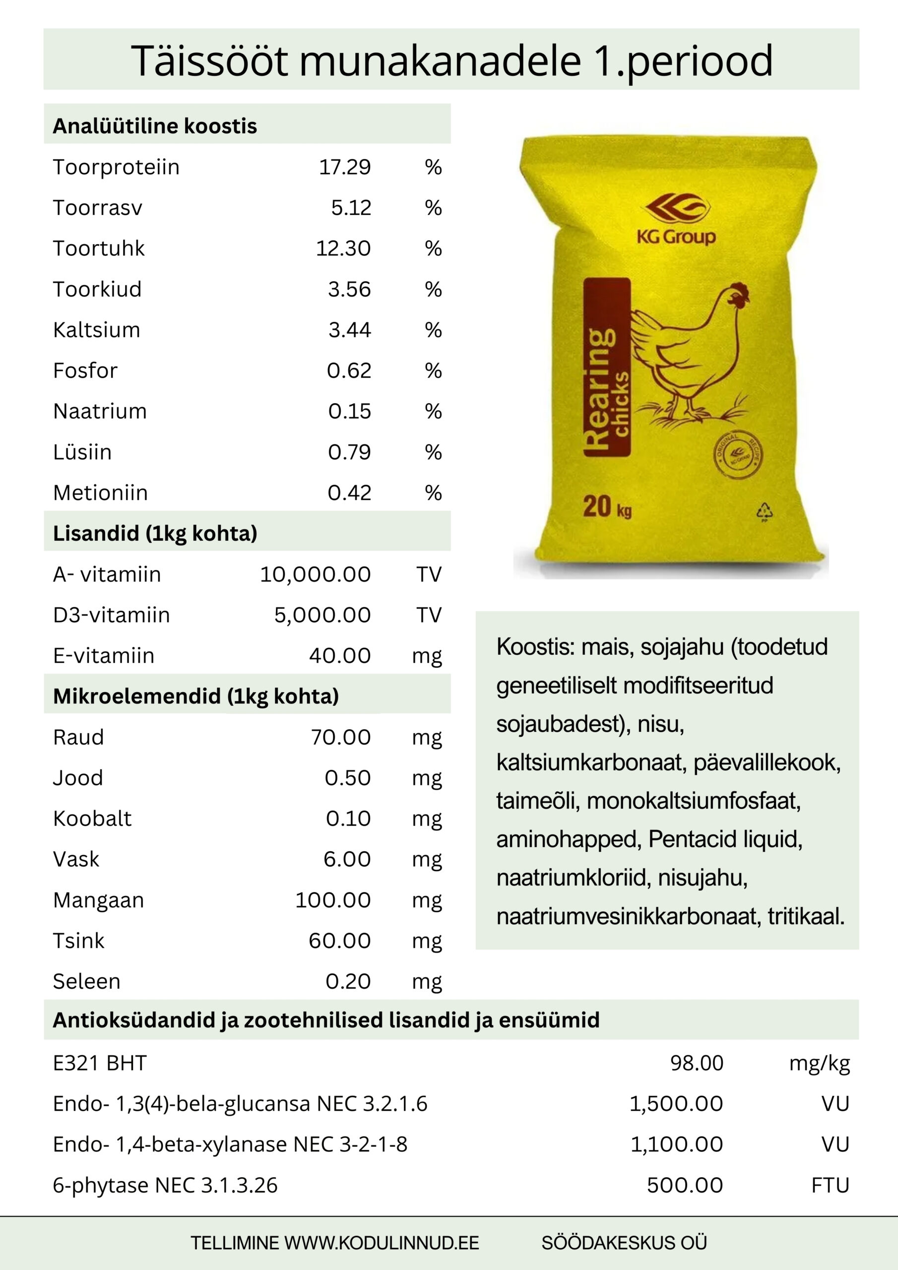 Täissööt munakanadele, 1.munemisperiood, mil munakana vajab palju kaltsiumit ja energiat munemiseks.