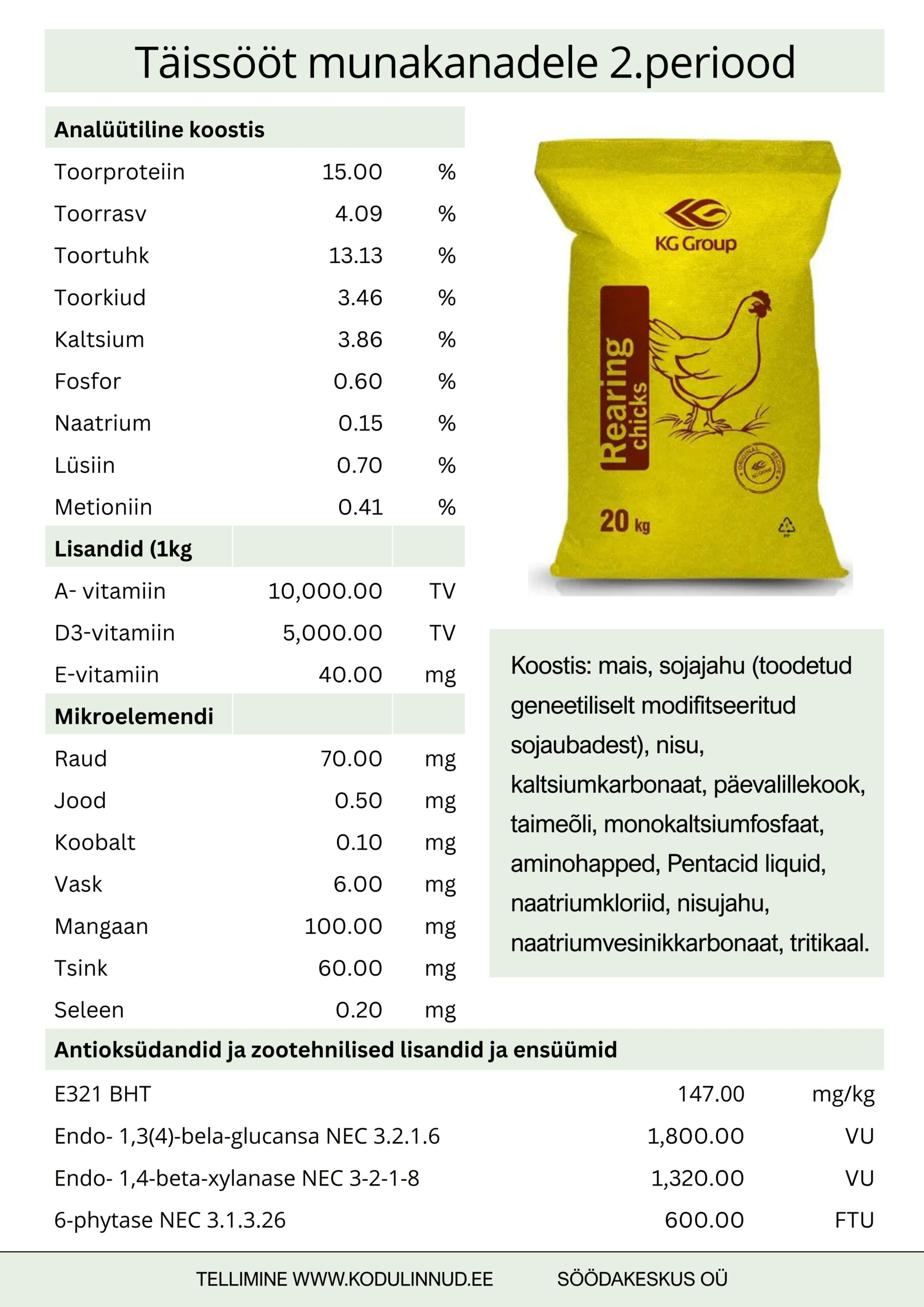 Täissööt munakanadele, 2. munemisperiood (alates 45. nädalast). Tasakaalustatud sööt, mis toetab munakanade vajadusi hilisemas munemisperioodis, mil kanad vajavad jätkuvalt kõrget kaltsiumisisaldust ja kvaliteetset energiat, et säilitada munakoore tugevus ja munemistempo.
