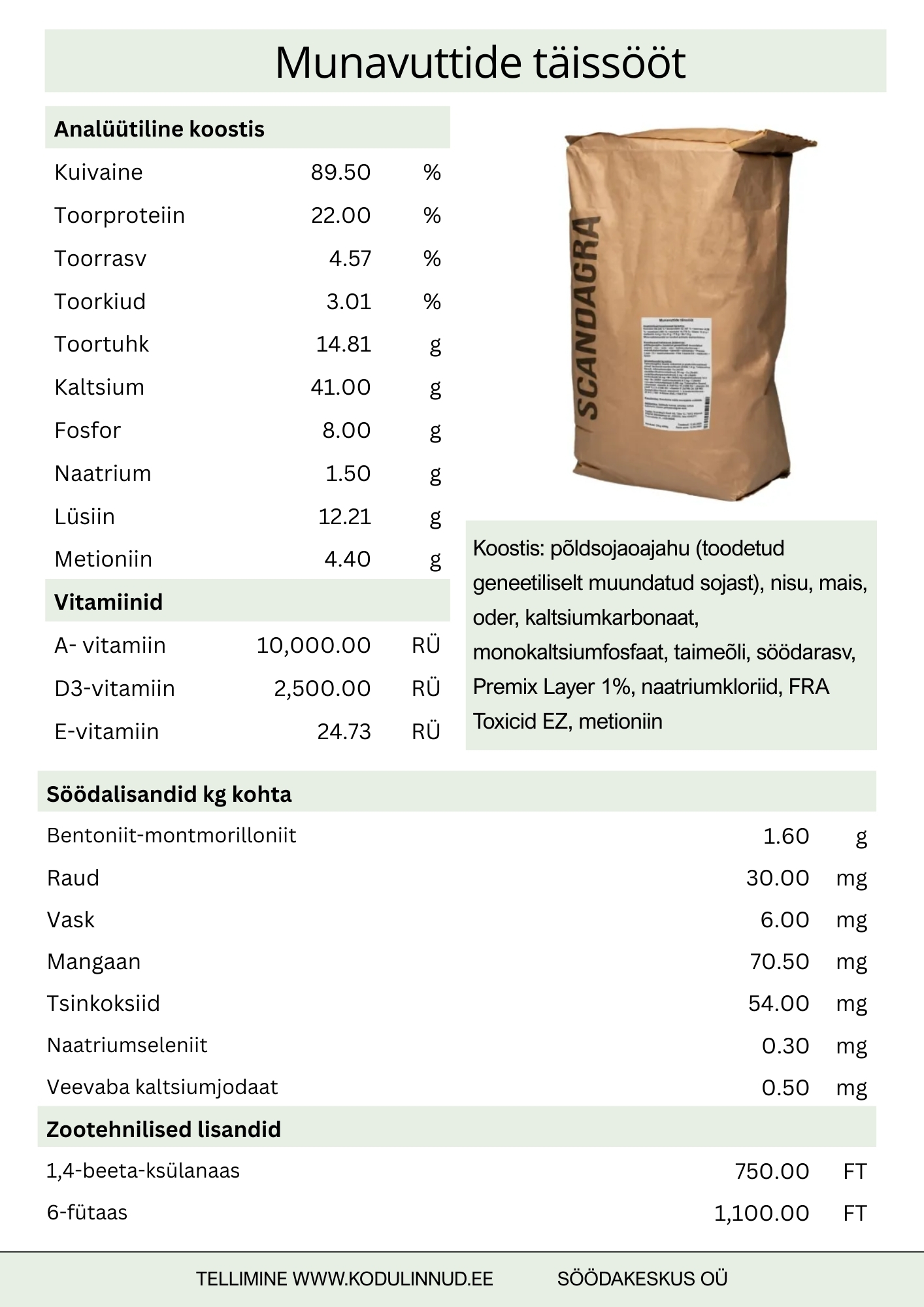 Sööt on koostatud kvaliteetsetest teraviljadest ja taimsetest proteiiniallikatest, mis tagavad munevatele vuttidele vajalikud toitained kogu munemisperioodi jooksul.