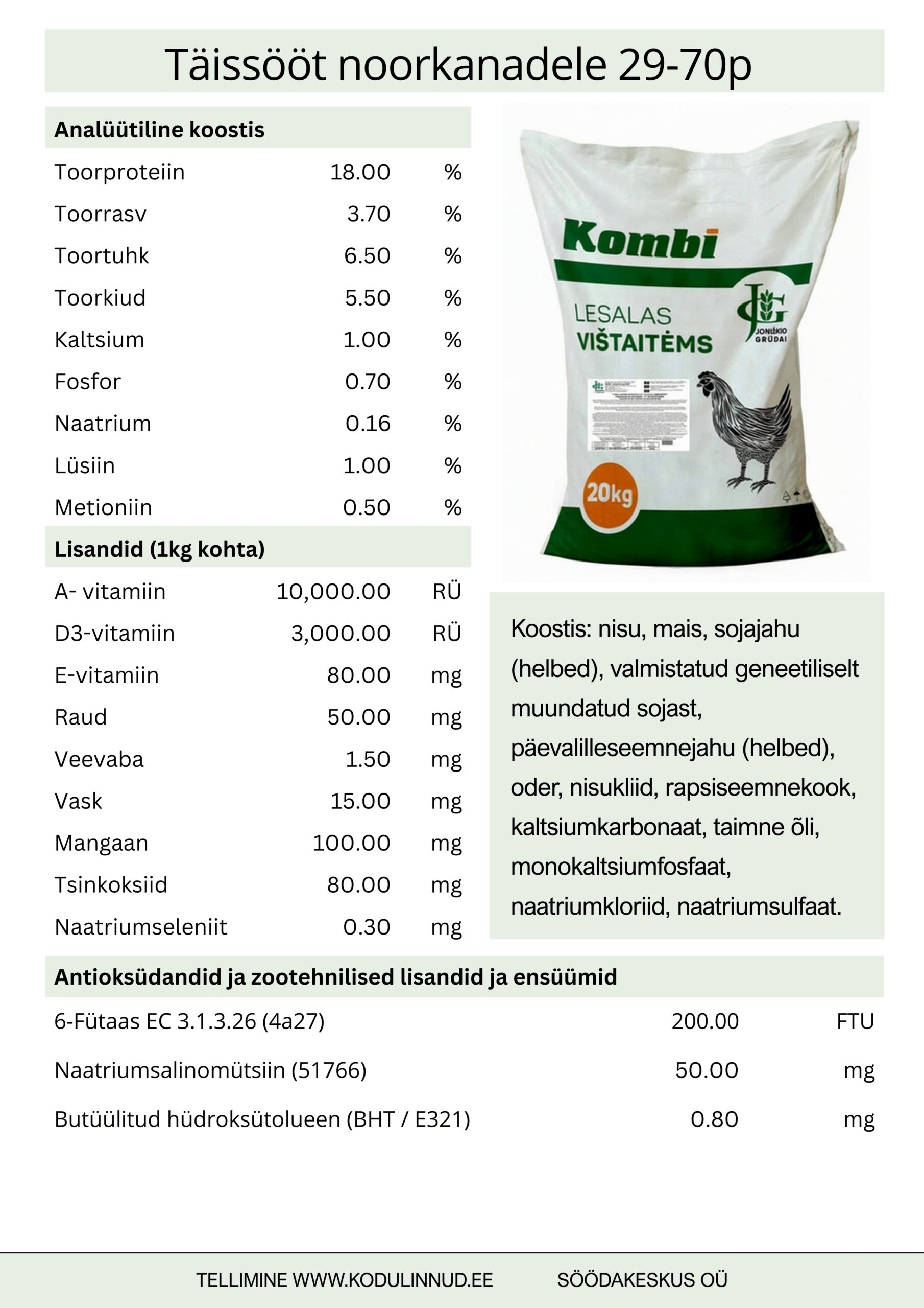 Täissööt noorkanadele 29–70 päeva on mõeldud kasutamiseks noorlindude intensiivse kasvu perioodil, mil õige toitainete tasakaal on eriti oluline. Granuleeritud sööt tagab ühtlase sööda tarbimise ning aitab vähendada söödakadu. Sööt sisaldab kõiki vajalikke valke, süsivesikuid, mineraalaineid ja rasvu, mis toetavad noorkanade luustiku arengut, lihaskasvu ning üldist vastupanuvõimet. Koktsidiostaatikumi sisaldus aitab ennetada koktsidioosi levikut, mis on noorlindude seas üks levinumaid terviseprobleeme.