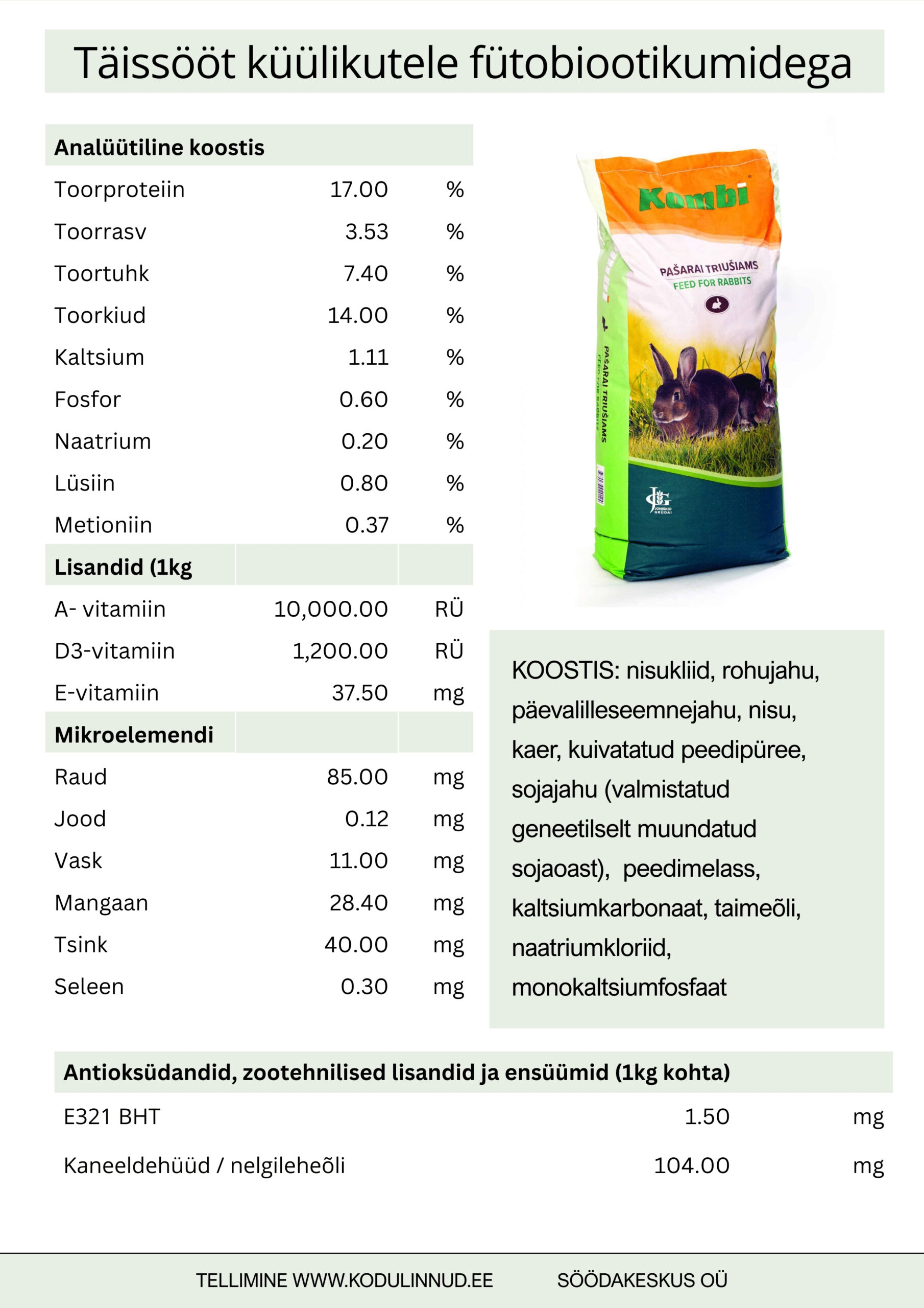 Praktilised katsed on näidanud, et fitobiotikumidega rikastatud sööt parandab sööda tarbimist ja konversiooni, toetab soolestiku tervist ning suurendab küülikute elujõulisust. Kiirem kasv ja parem rümbakaal aitavad saavutada paremat tootlikkust, samal ajal kui ammoniaagi sisaldus loomapidamisruumides püsib madalam. KOMBI täissööt küülikutele on usaldusväärne valik neile, kes soovivad tagada oma loomadele hea tervise, stabiilse kasvu ja tõhusa söötmise ilma antibiootikumide vajaduseta.