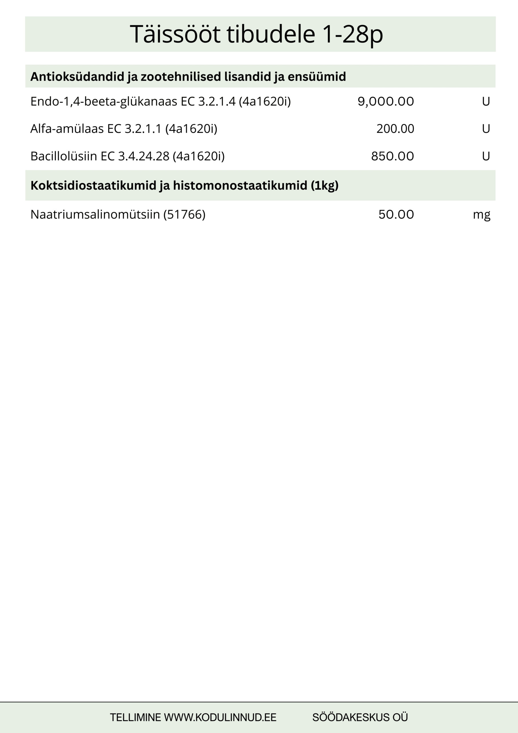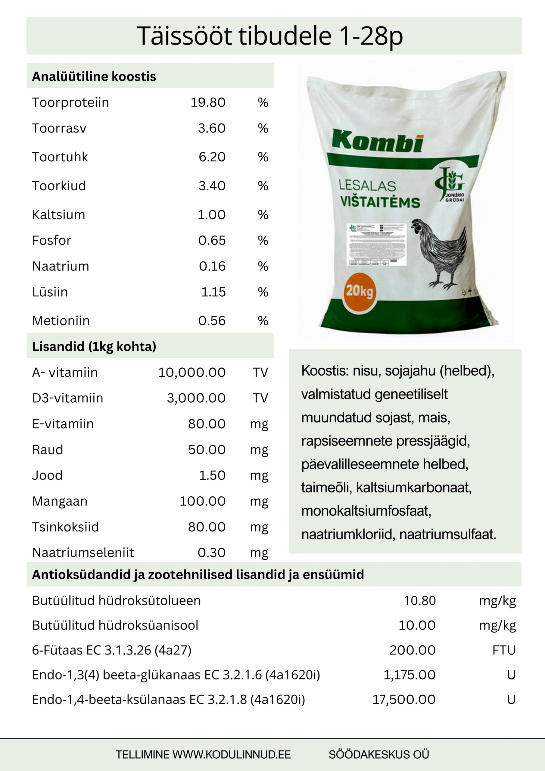Täissööt tibudele 1–28 päeva on kvaliteetne granuleeritud tibusööt, mis on mõeldud tibude igapäevaseks söötmiseks nende elu esimestel nädalatel. Sööt vastab täielikult lindude kasvufüsioloogilistele vajadustele ning toetab tugevat ja ühtlast arengut.