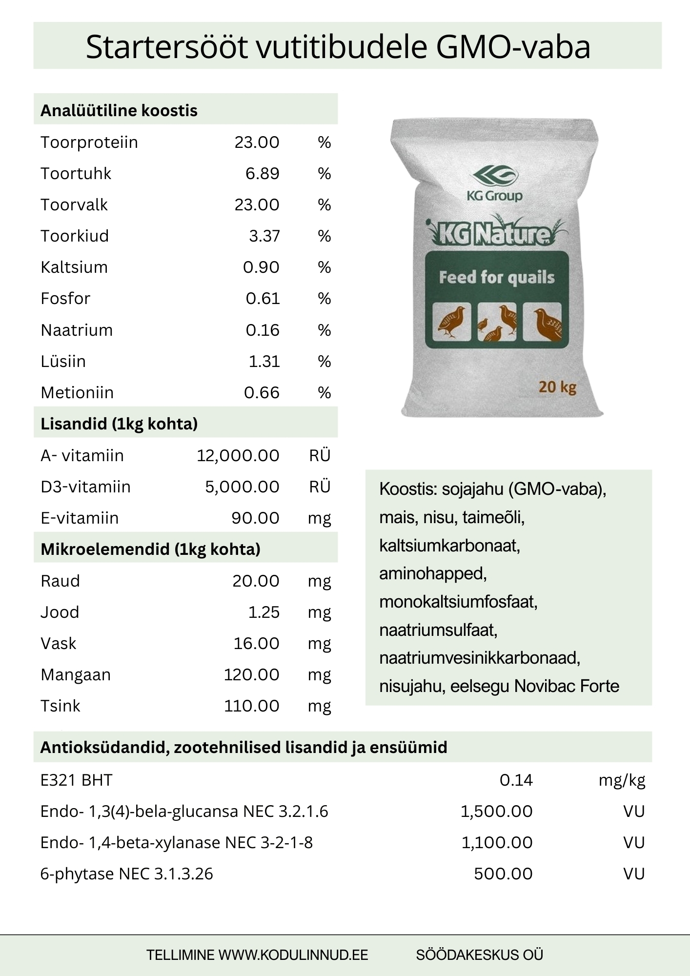Lisatud ensüümid parandavad sööda seeduvust ja toitainete kasutegurit, muutes söödakasutuse tõhusamaks. GMO-vaba sojajahu ning kvaliteetsed toorained muudavad selle sööda sobivaks nii koduseks vutikasvatuseks kui ka professionaalseks tootmiseks.